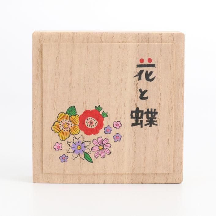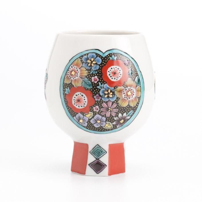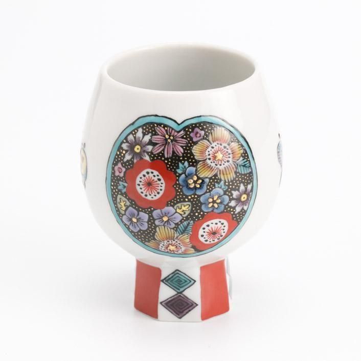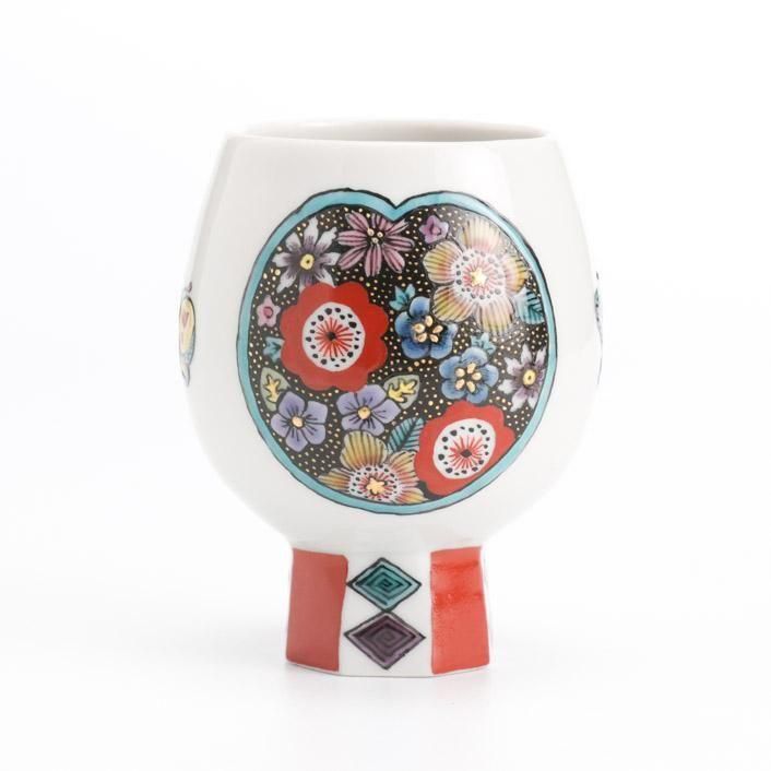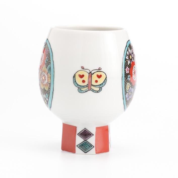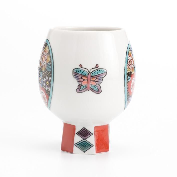 レトロな雰囲気で草花と蝶をグラフィカルに描いた九谷焼の高台盃です。艶のある九谷の絵具、赤と黒の色彩のコントラストが印象的な作品です。