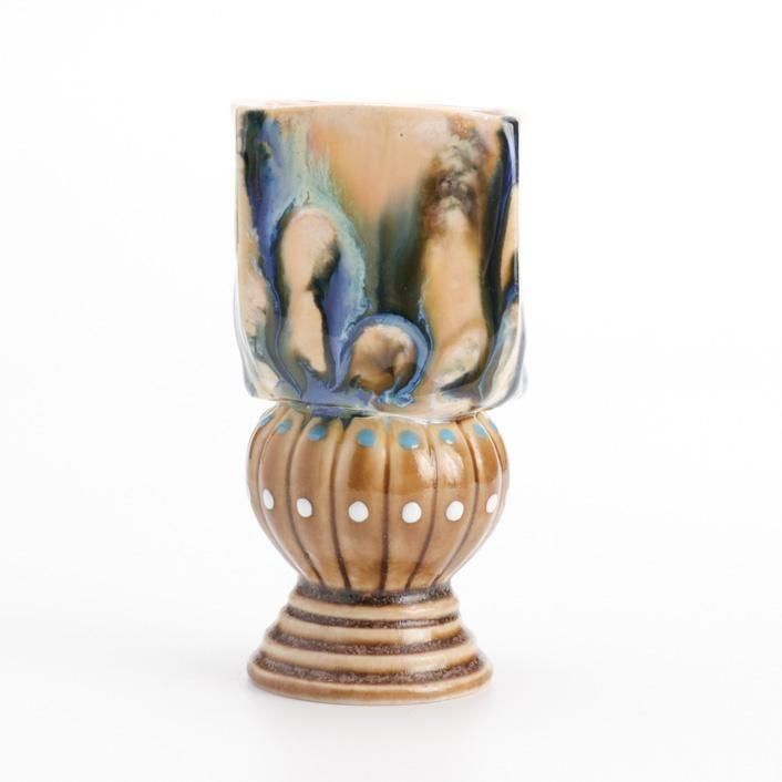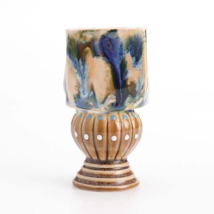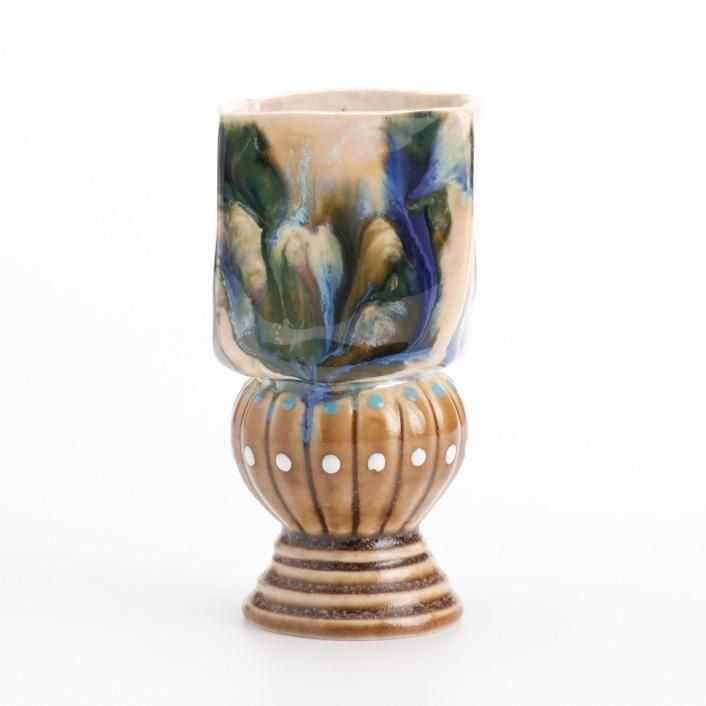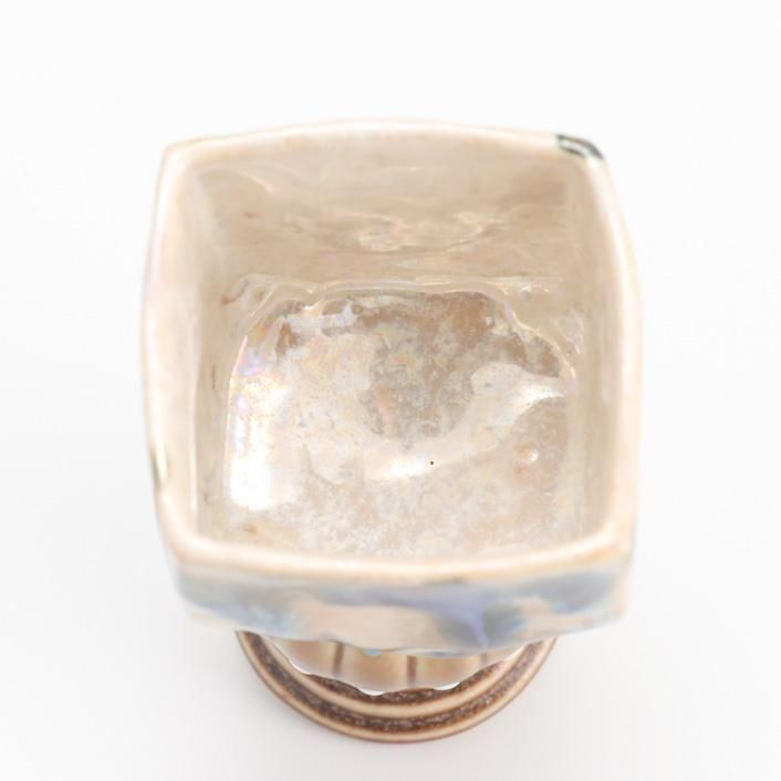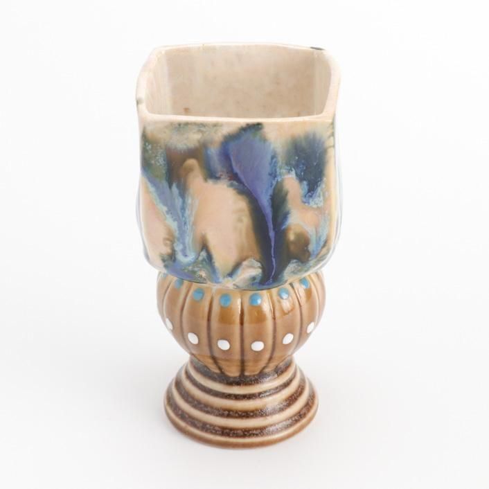 ラスター釉による複雑なオパール模様が美しく、その上から窯の中で自然と垂れて生まれた上絵模様は様々な陶芸の技術や技法を熟知した作家による、遊び心満点の作品です。足元には金彩が施されています。