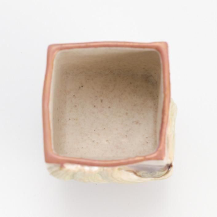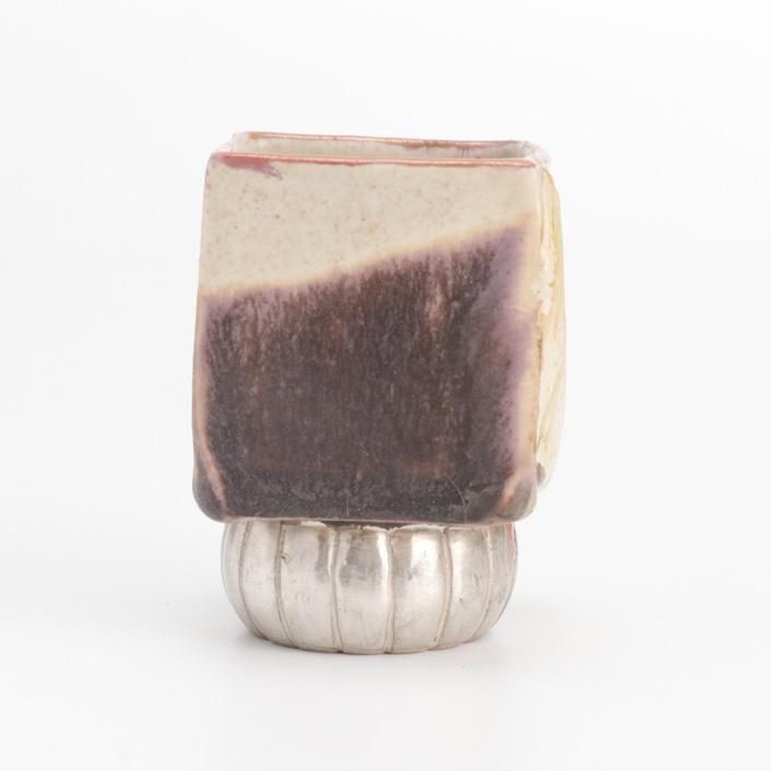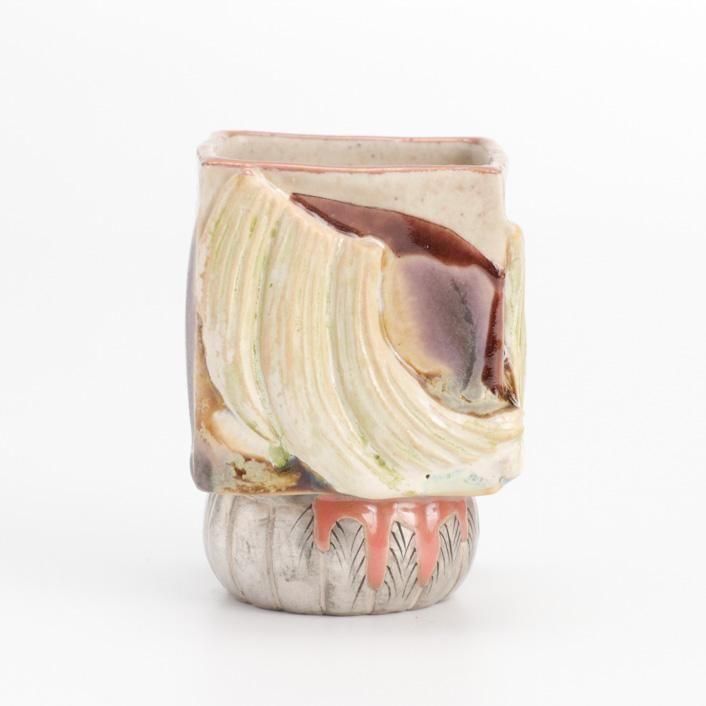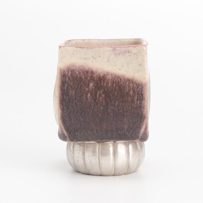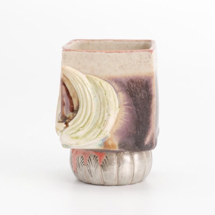 樹木をイメージとしたレリーフが美しく、その上から窯の中で自然と生まれた上絵模様は様々な陶芸の技術や技法を熟知した作家による、遊び心満点の作品です。足元には銀彩が施されています。