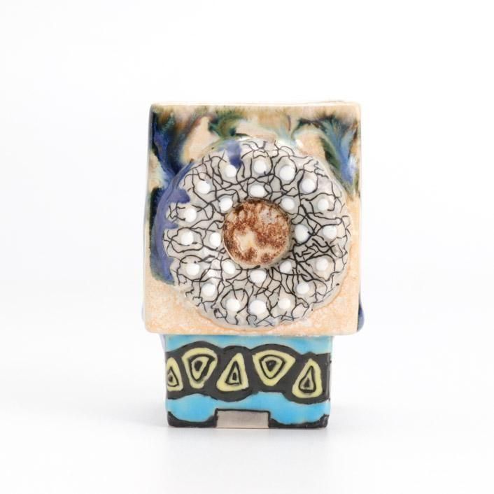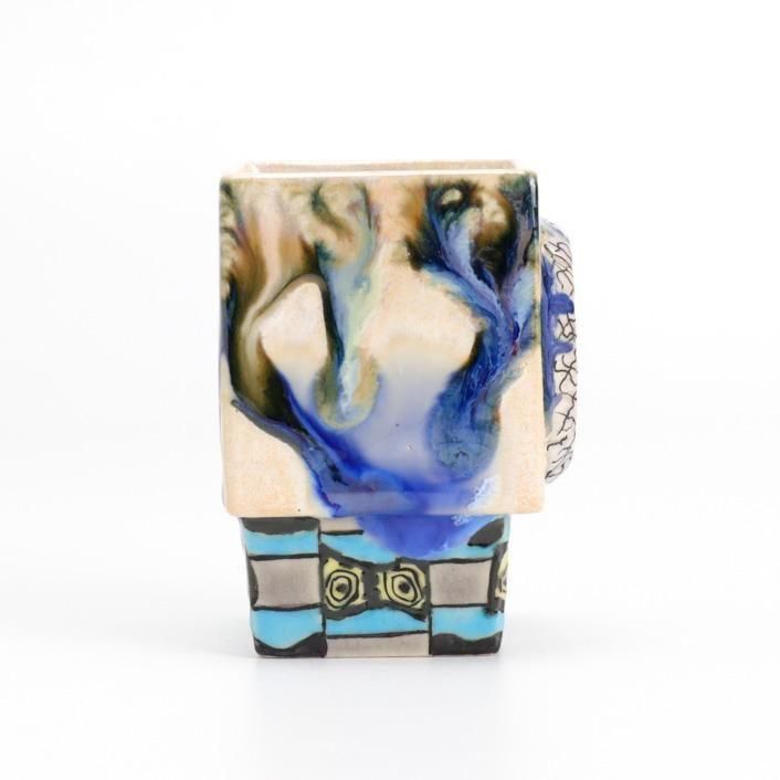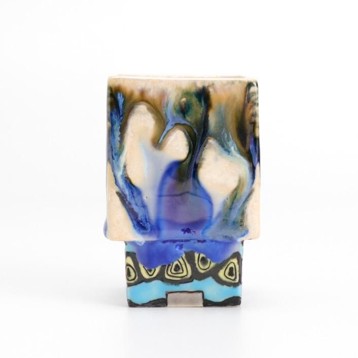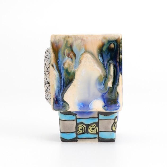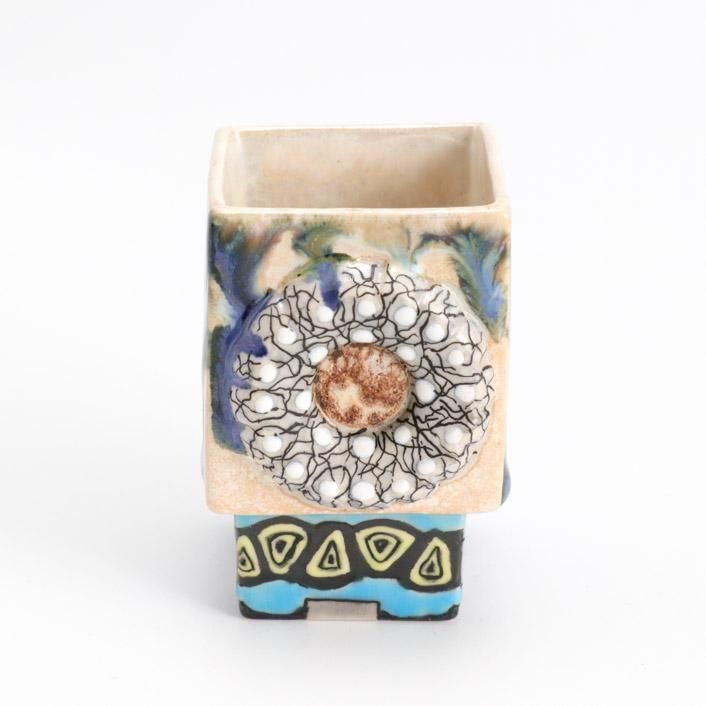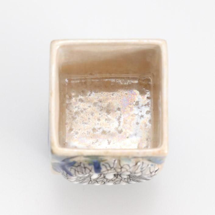 ラスター釉による複雑なオパール模様が美しく、その上から窯の中で自然と垂れて生まれた上絵模様は様々な陶芸の技術や技法を熟知した作家による、遊び心満点の作品です。足元には金彩が施されています。