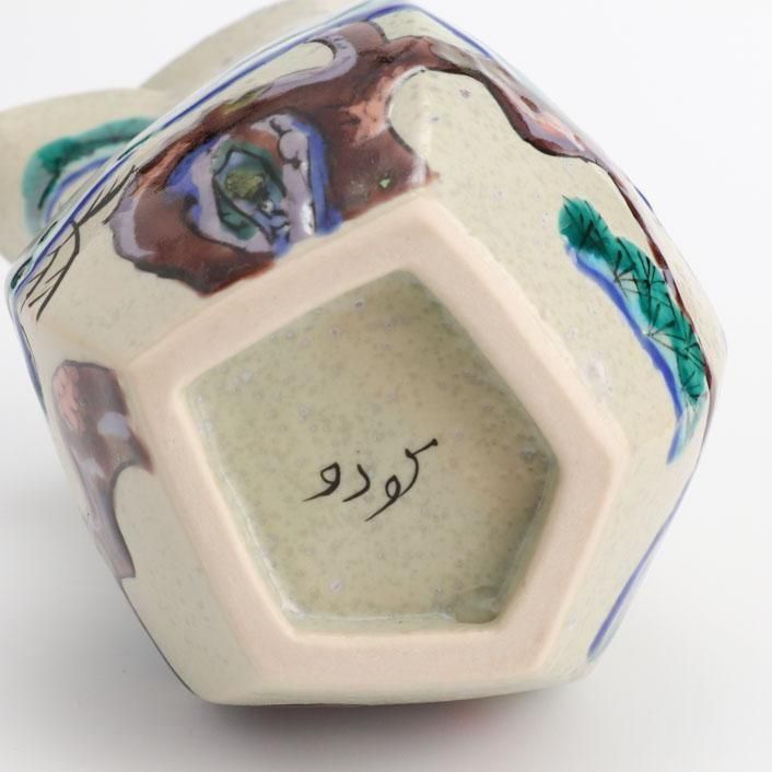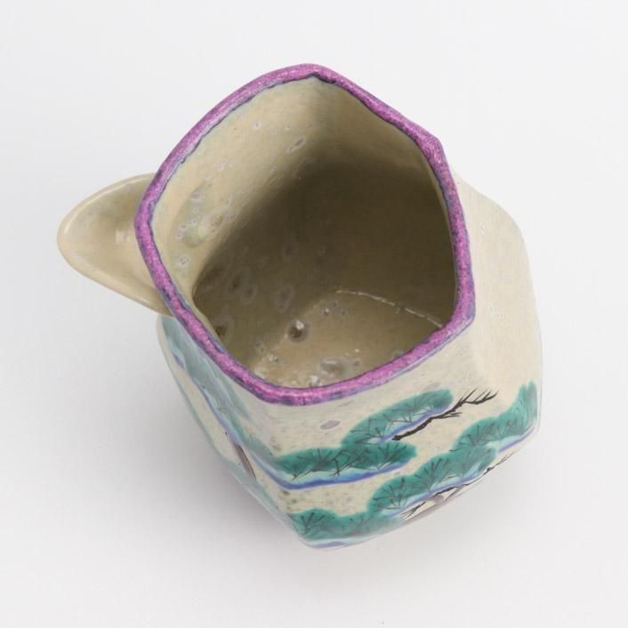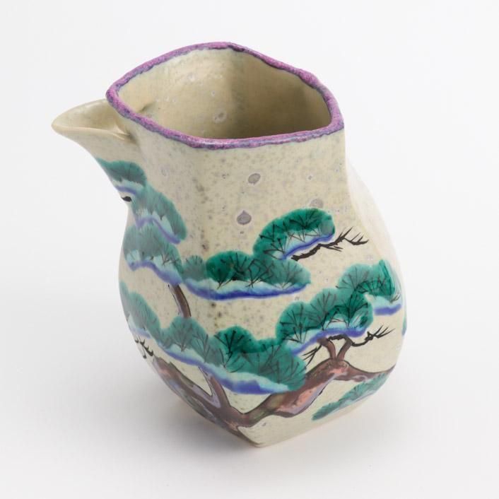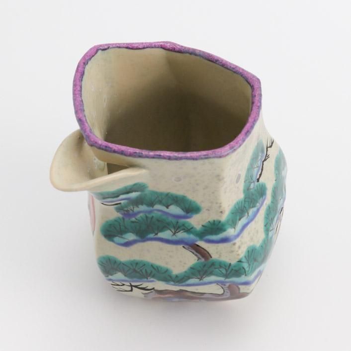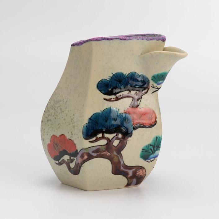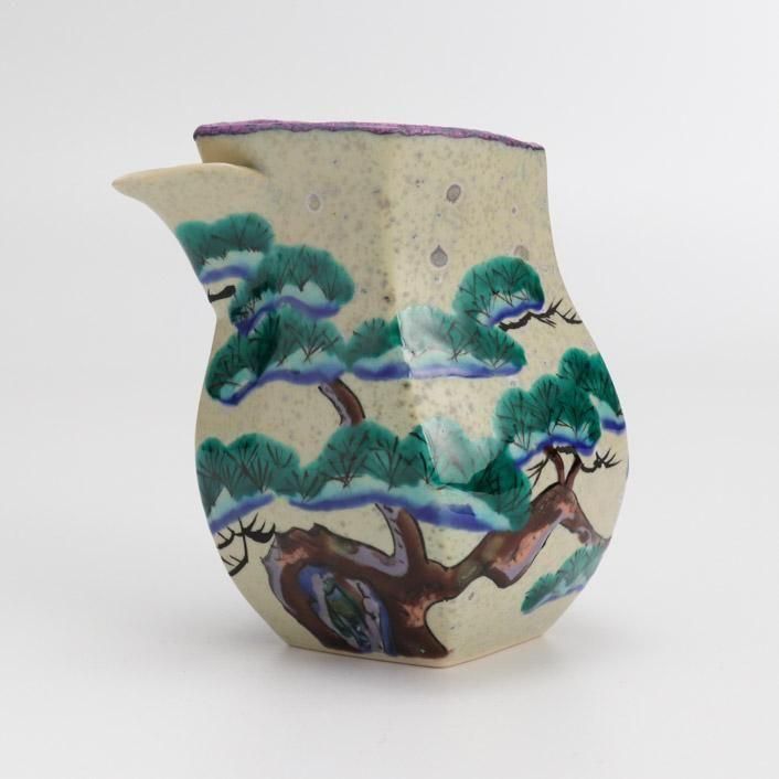 九谷の和絵具による艶やかな色絵で松の柄が施されています。上絵や釉彩模様は様々な陶芸の技術や技法を熟知した作家による、遊び心満点の作品です。